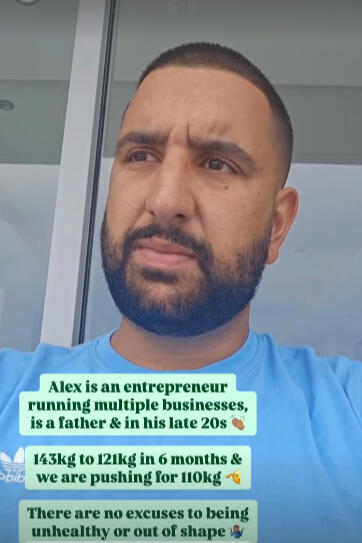 Alex, an entrepreneur, went from 143kg to 121kg in 6 months — and now we’re pushing for 110kg.